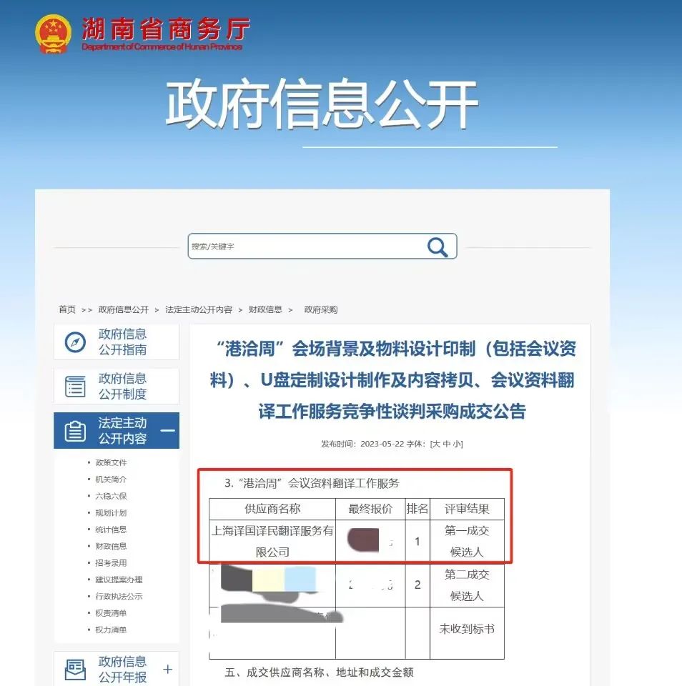 查看详情5月22日,译国译民与湖南省政府达成合作,以第一成交候选人的身份,成功中标“港洽周”会议资料翻译工作服务!
